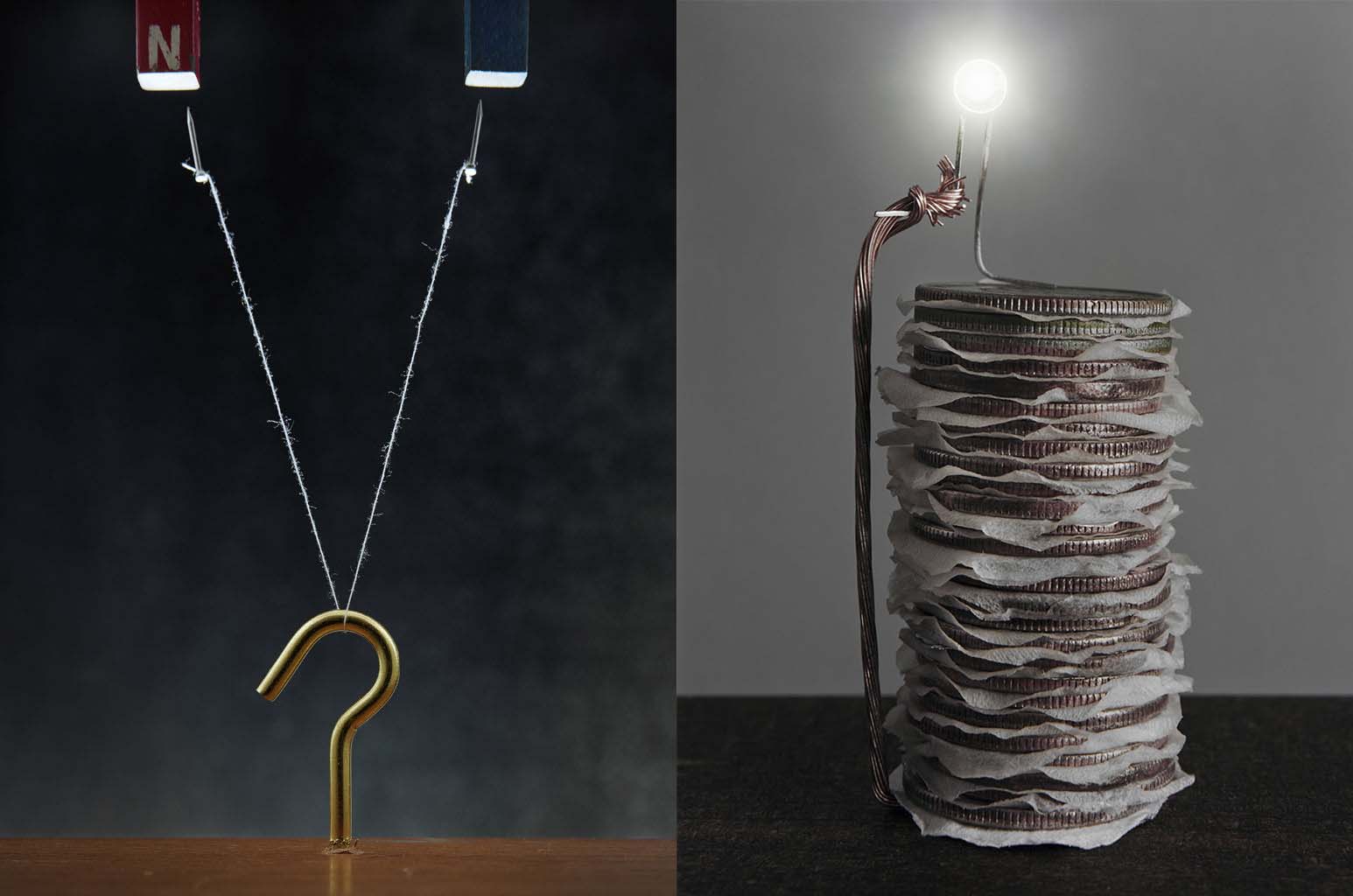 Study with Hook, Nails, and String II (left) and Coin Battery (right)